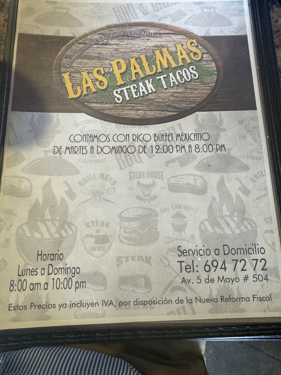 Welcome to Las Palmas Steak Tacos, a hidden gem nestled in the heart of Nuevo Casas Grandes, Chih., where the vibrant flavors of authentic Mexican cuisine come alive. The restaurant offers a casual atmosphere that blends friendly service with comfort, making it an ideal spot for families and friends alike.